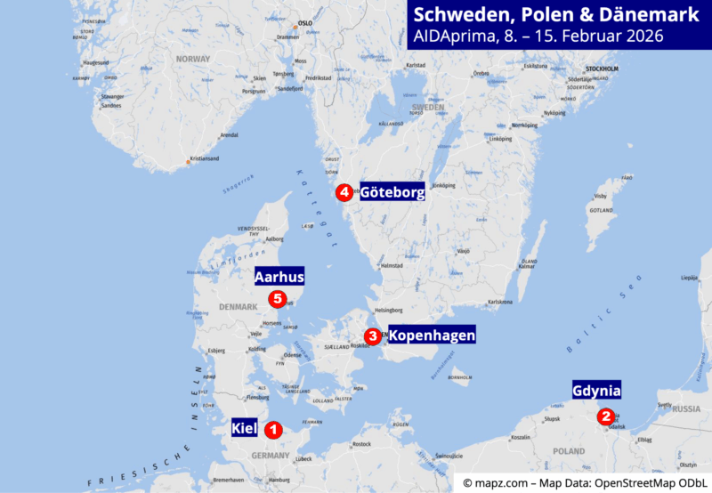 Kreuzfahrt, 08.02. – 15.02.2026 | Eine Winterreise ab/bis Kiel in die Ostsee und das Kattegat mit Gdynia, dem Hafen von Danzig. Dazu mit Kopenhagen und Aarhus die beiden größten dänischen Städte sowie die westschwedische Metropole Göteborg.
